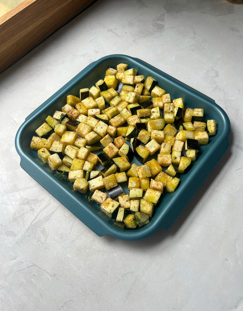 - Step 1Mix the aubergine with thyme, oregano, olive oil, salt and pepper and place on a baking tray. Roast at 190c until golden and tender (25-30 mins).