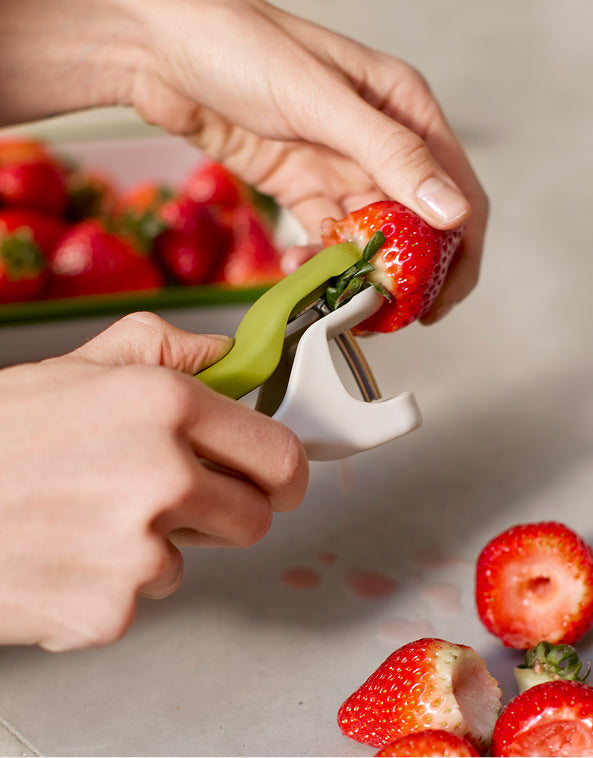 - Step 1Pit the olives and cherries or hull the strawberries using our Tweezy™ tool.