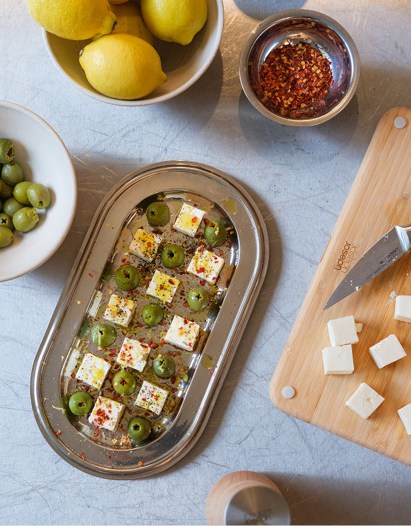 The checkerboard pattern is as eye-catching as it is easy to assemble, and the mix of salty cheese with juicy fruit or briny olives is a flavour combination your guests will love. Garnished with lemon zest, olive oil, and a hint of spice, this is the perfect bite-sized treat to kick off your celebrations.