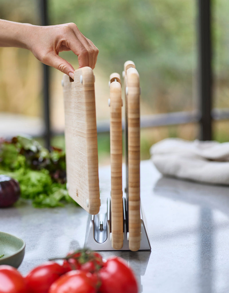 Nest™ is the must-have, space-saving kitchenware range that includes mixing bowls, cookware, utensils, and chopping boards. The 3-piece, colour-coded chopping board sets keep space-saving at their core with a neat, organised storage stand that holds the boards slightly apart to improve airflow. Stainless-steel bars allow for easy board selection from the stand, while the knife-friendly, textured cutting surfaces are a joy to chop on. Available in regular or large sizes, they are designed for all kinds of kitchens and cutting needs.