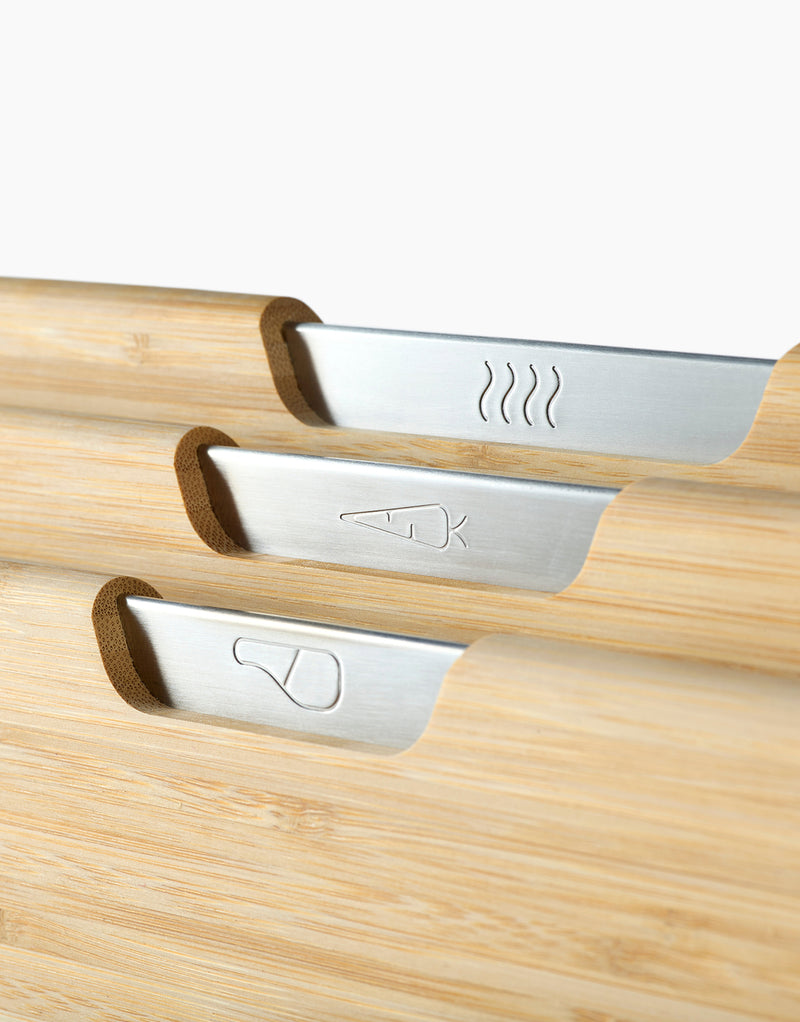 Our (anything but) regular Folio™ sets come with a tiered design and four double-sided boards that feature knife-friendly, textured cutting surfaces and non-slip feet for safer chopping. The case holds the boards apart too, allowing air to circulate so they can dry efficiently.