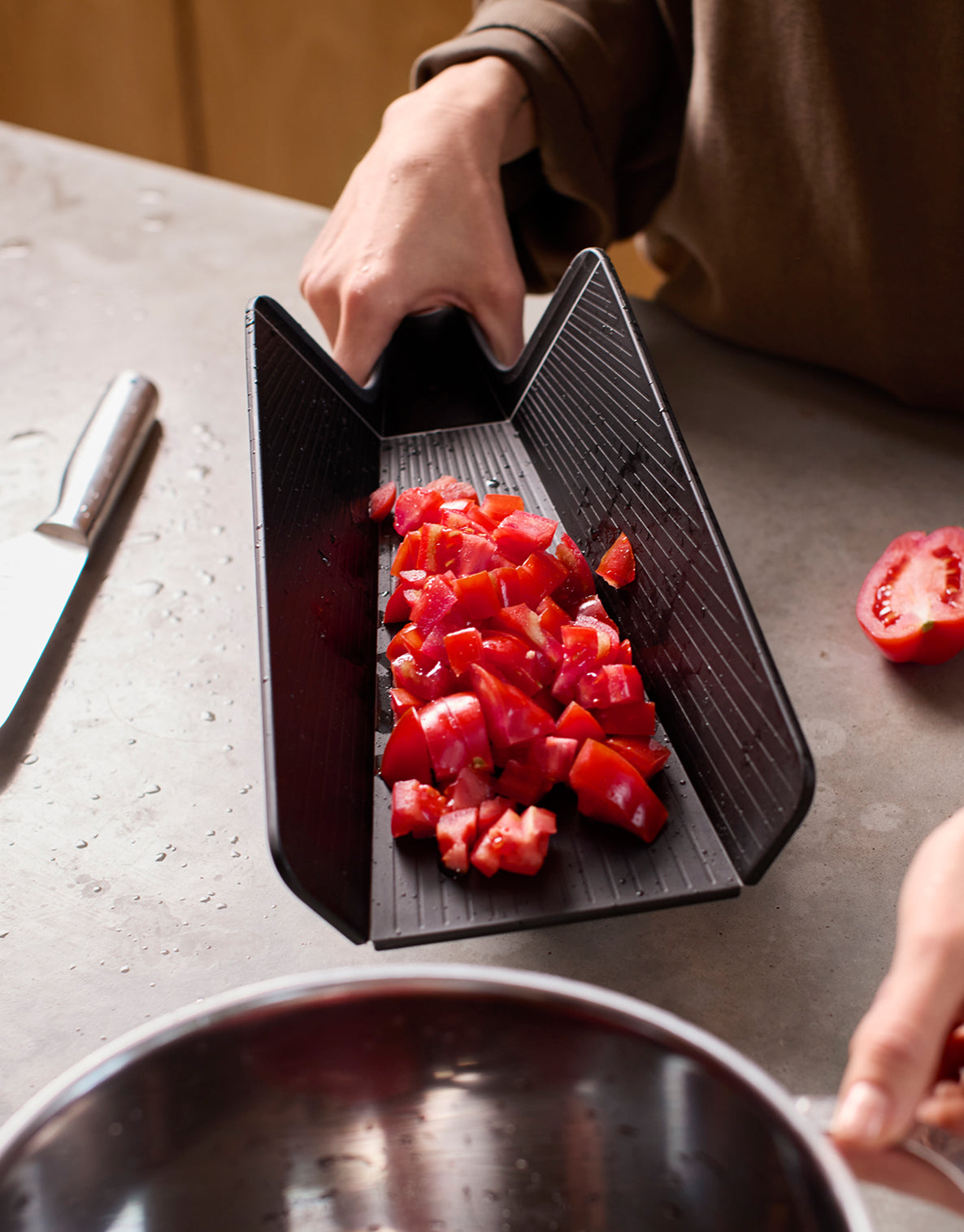 Our award-winning Chop2Pot™ chopping board cuts out the mess of moving chopped food into pans or off-cuts into the compost caddy. The clever, foldable design creates a chute for easy pouring and no-mess food transfer. Simply squeeze the soft-grip handle, and the edges of the board fold.