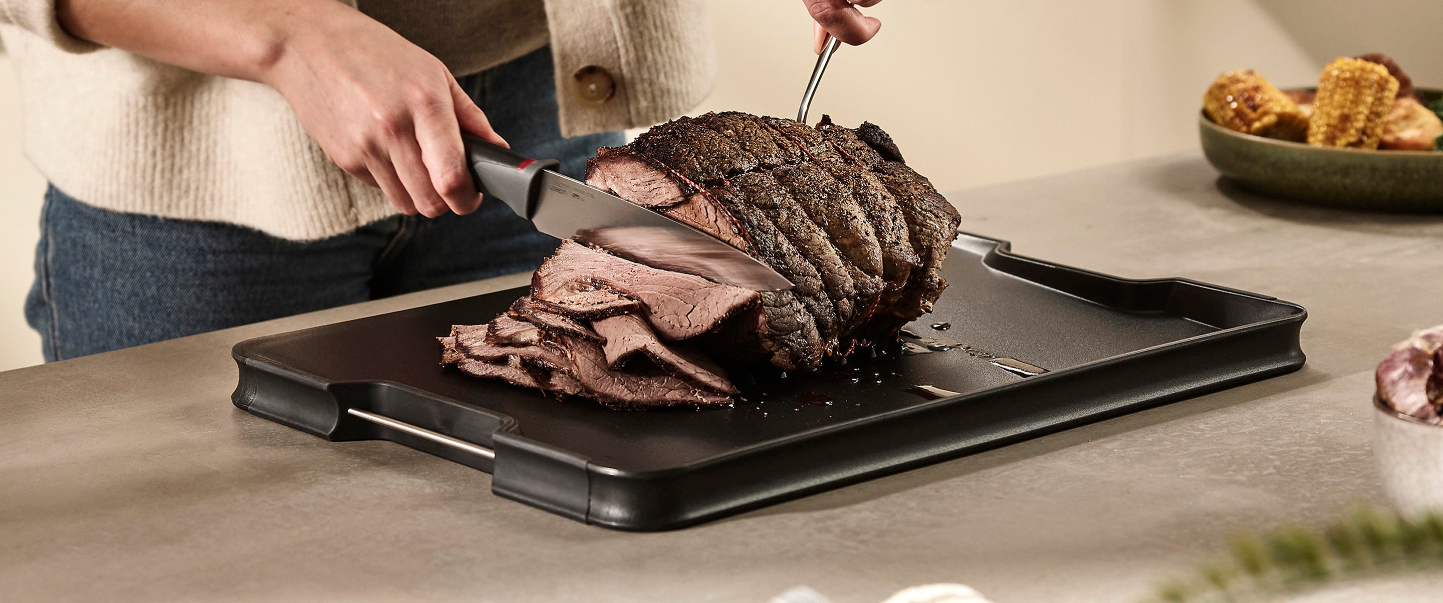 As the name suggests, Cut&Carve™ serves two functions: cutting and carving. Often, large portions of meat can be tough to cut as they slide across the board, and the juices released can drip onto the kitchen surface causing a mess.