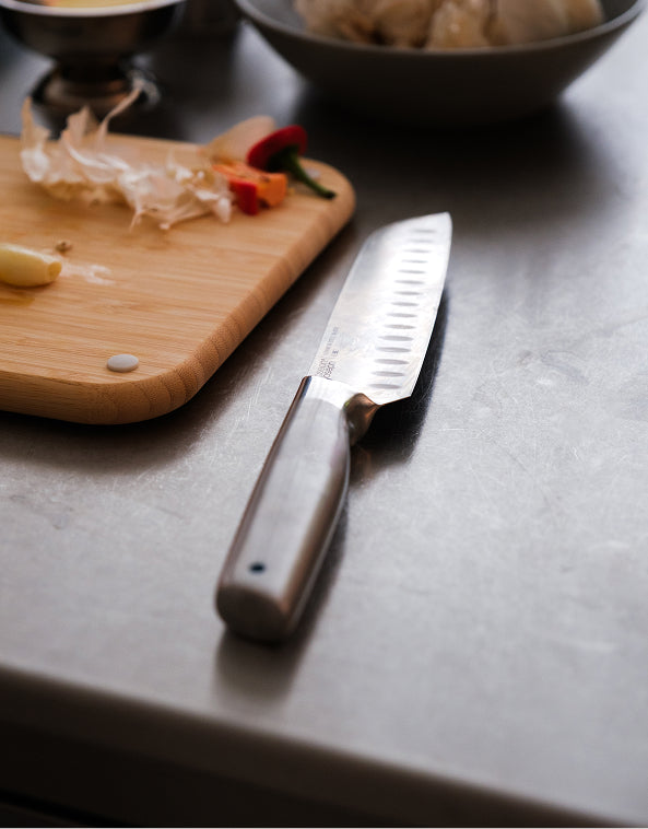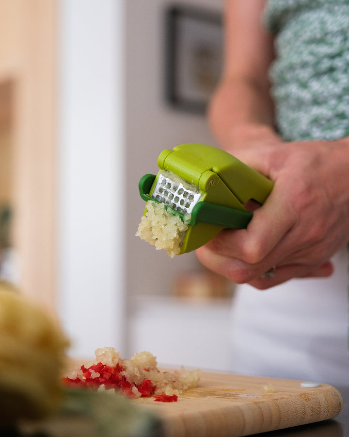 This powerful garlic press crushes cloves with ease and features a wiper blade and a handy scraping tool for easy cleaning.