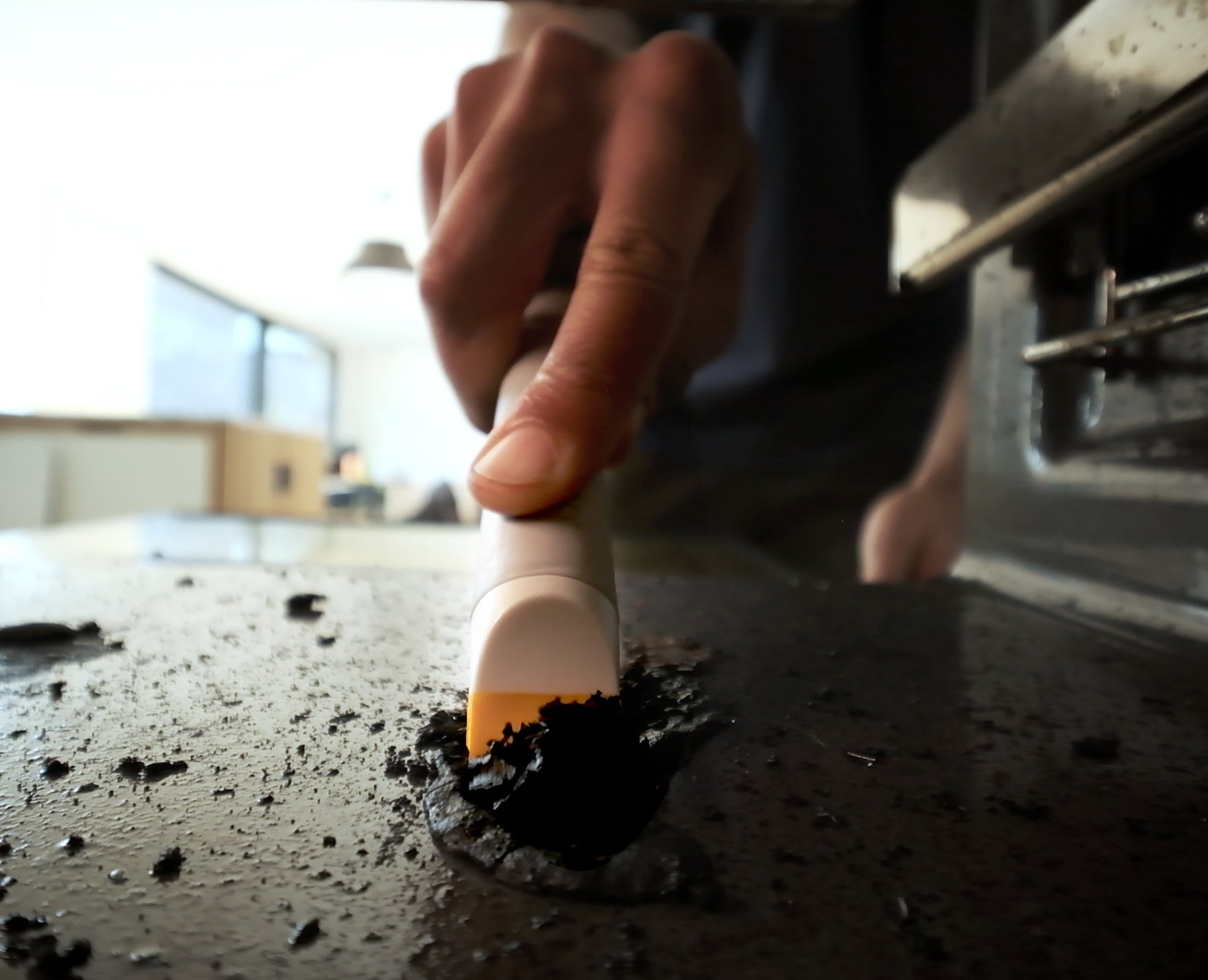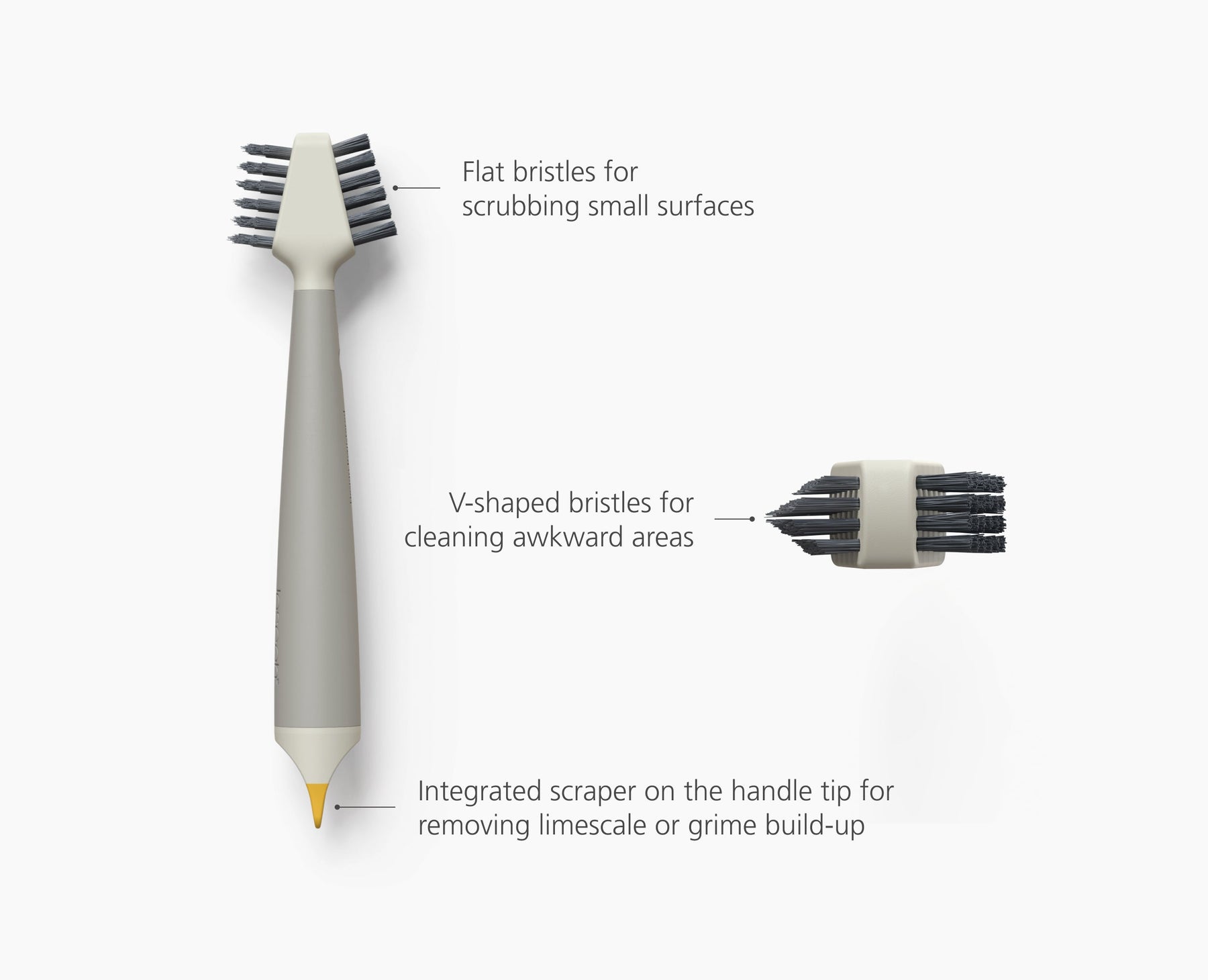 - Integrated scraper on the handle tip for removing limescale or grime build-up.