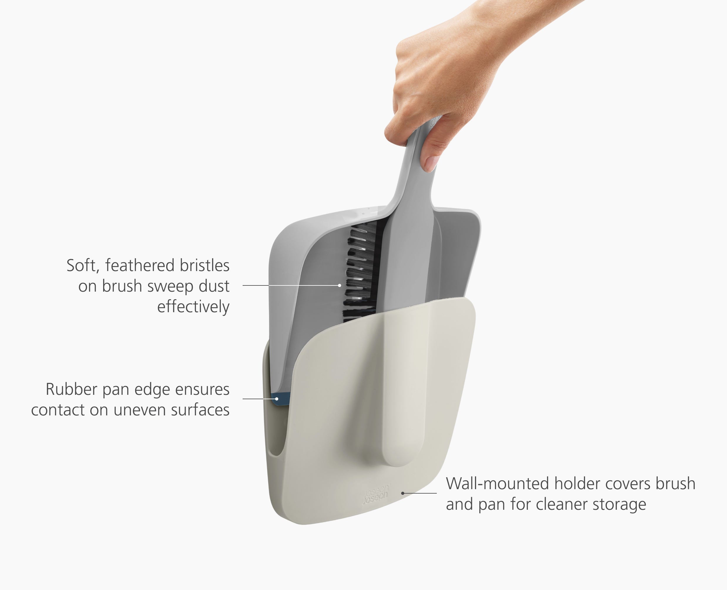 This dustpan and brush set includes a Dust-shield™ holder for cleaner and more hygienic storage. The brush has angled bristles and pan has a rubber edge for more efficient sweeping.