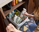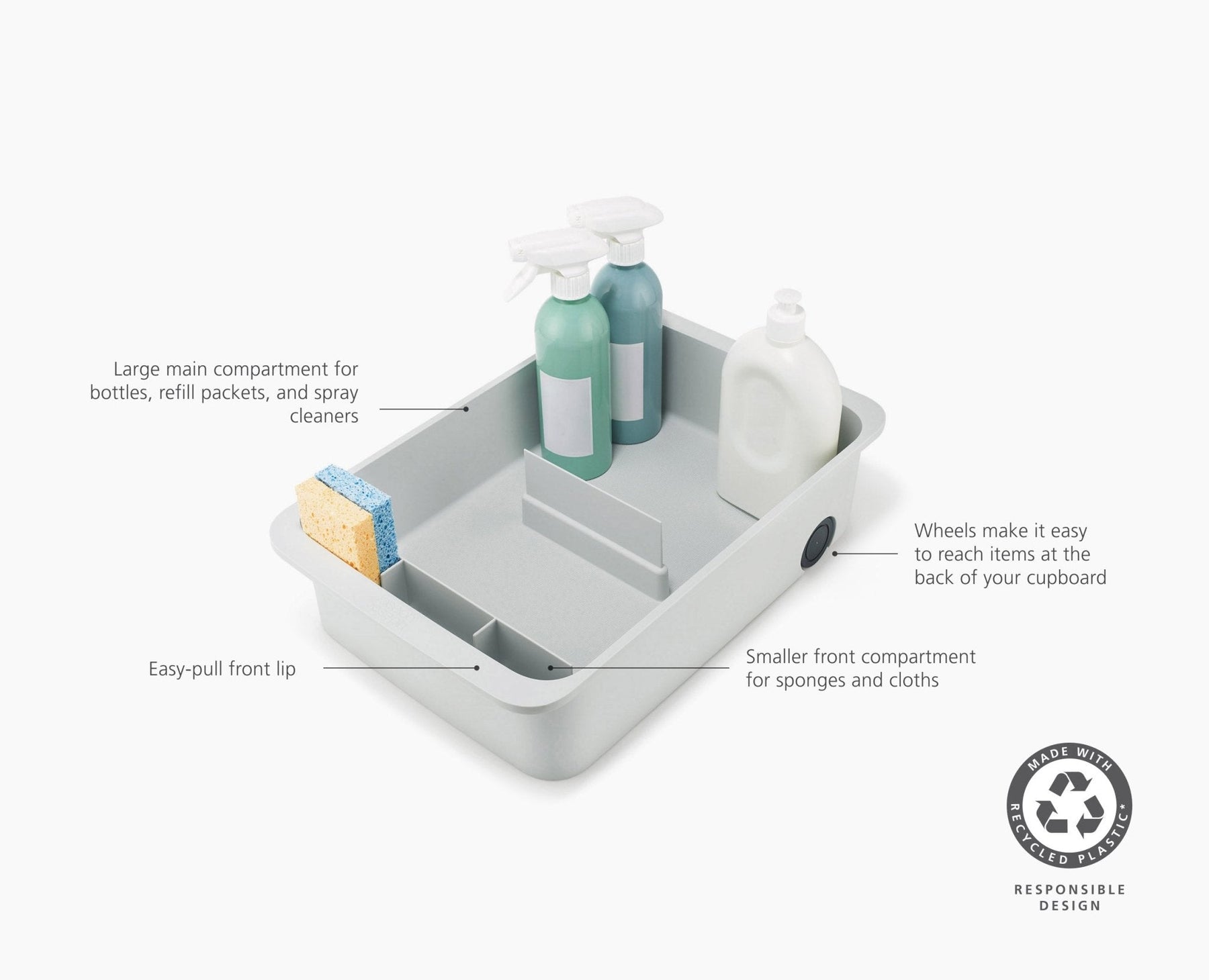 Tame your cleaning cupboard with this large storage caddy. Designed for extra-large bottles and packets, it features a divider for organisation and smooth-rolling wheels for easy access.