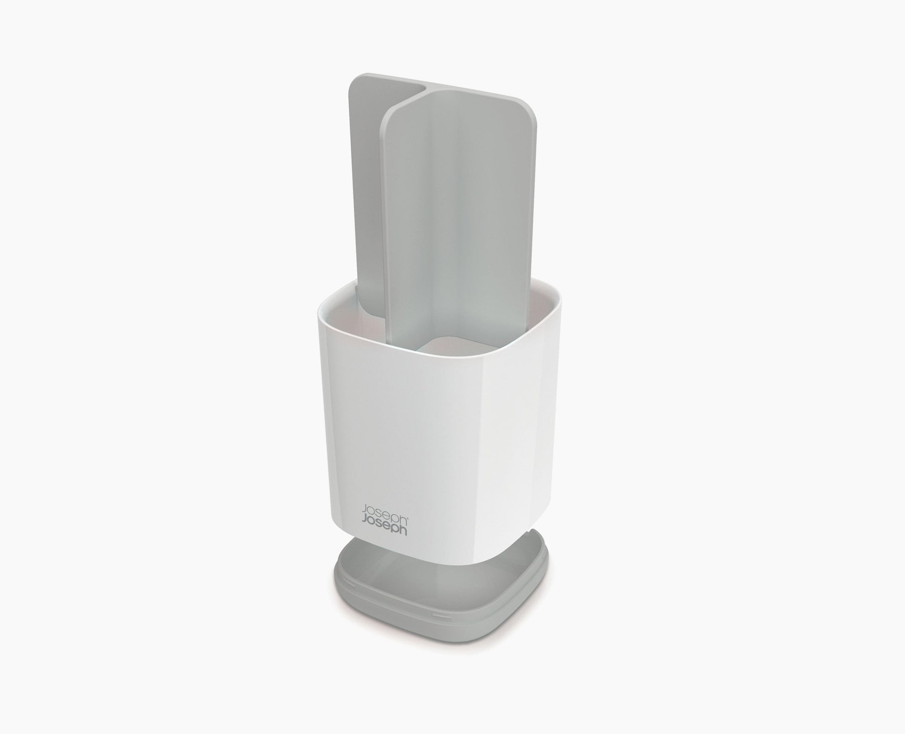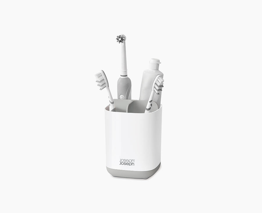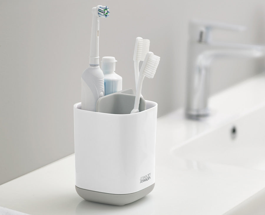 These toothbrush caddies have different sections for organising a variety of oral care items such as manual or electric toothbrushes and toothpaste tubes.