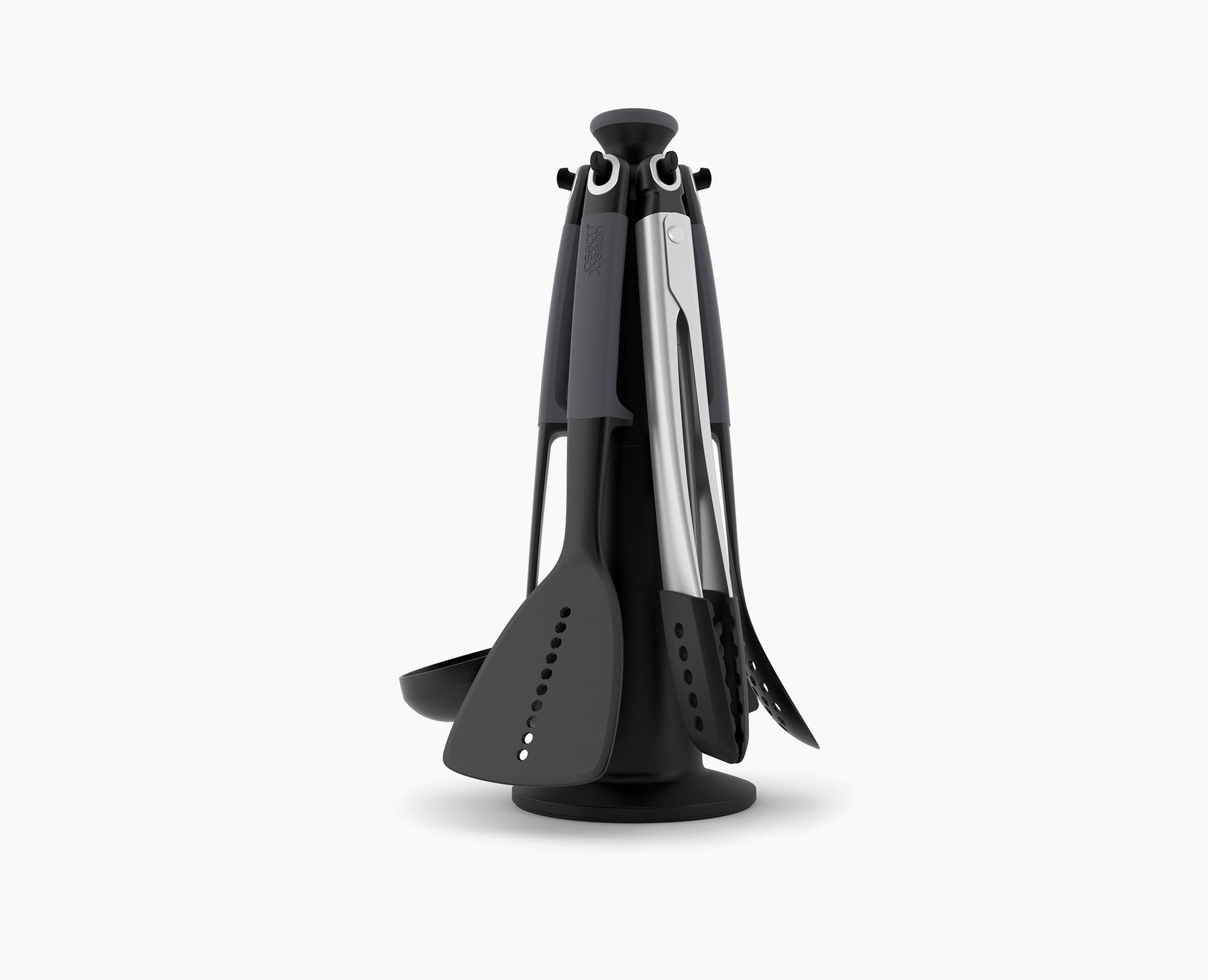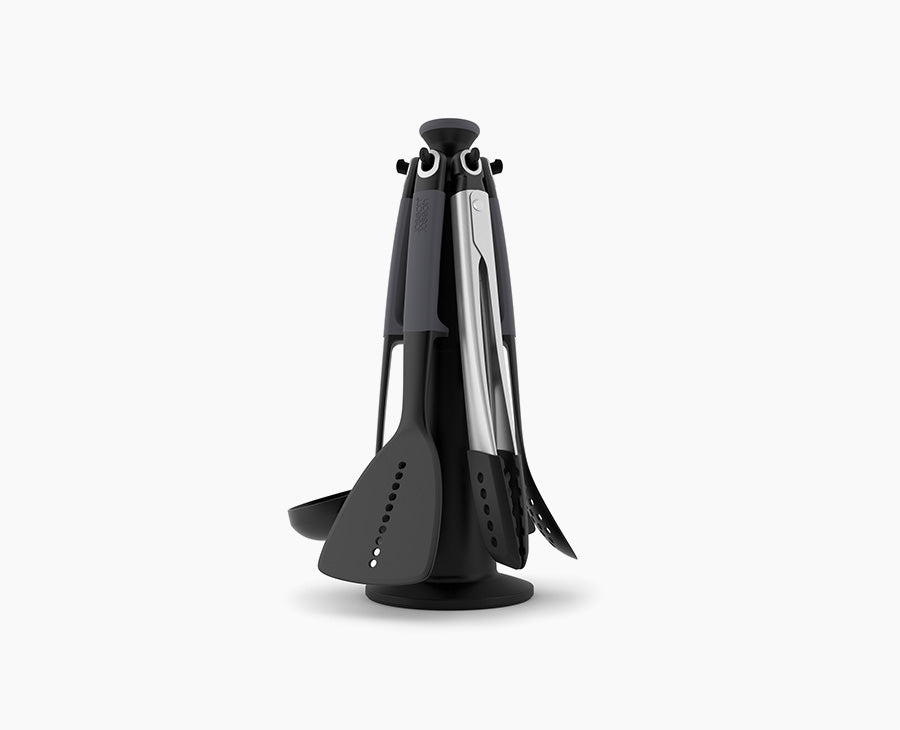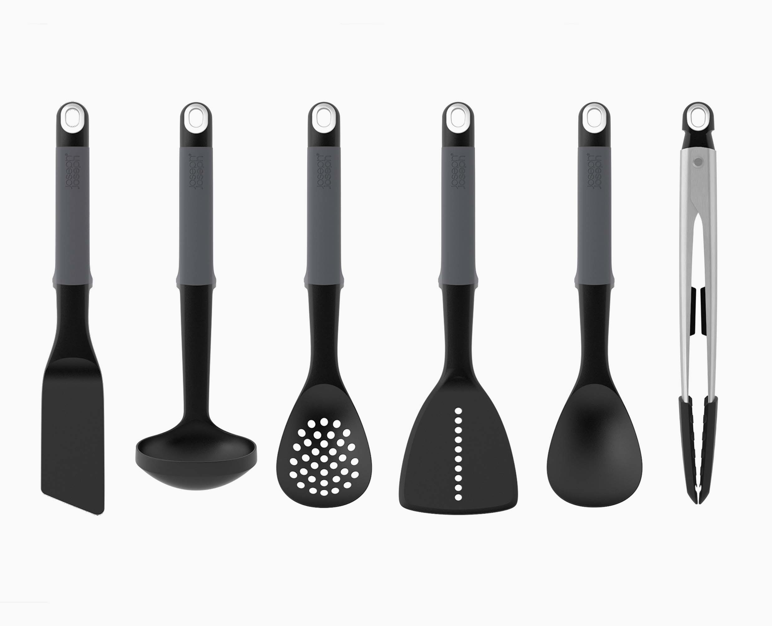 - Set includes: solid spoon, stainless steel tongs, slotted turner, flexible turner, ladle and slotted spoon