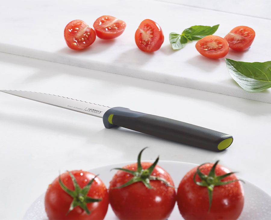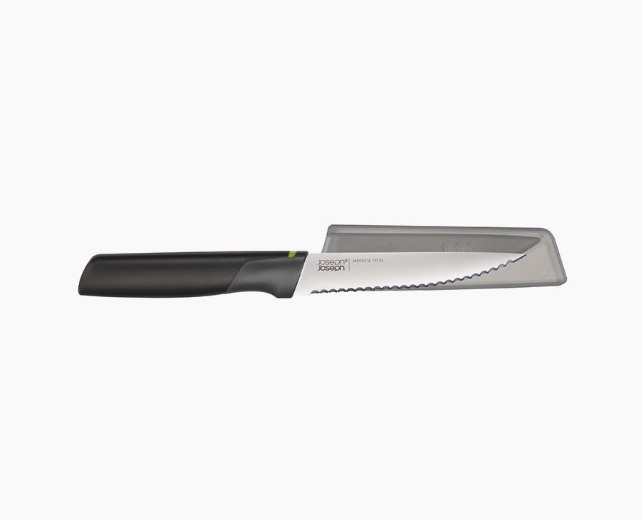 - Weighted handle and integrated knife rest prevents blade from touching the work surface when placed down