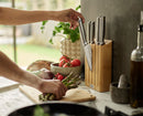 Crafted from Japanese stainless-steel, each knife in this set is designed for precise cutting and comes housed in a bamboo knife block. Elevate™ technology minimises mess by keeping the knife tips off work surfaces with weighted handles and integrated tool rests.