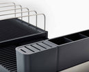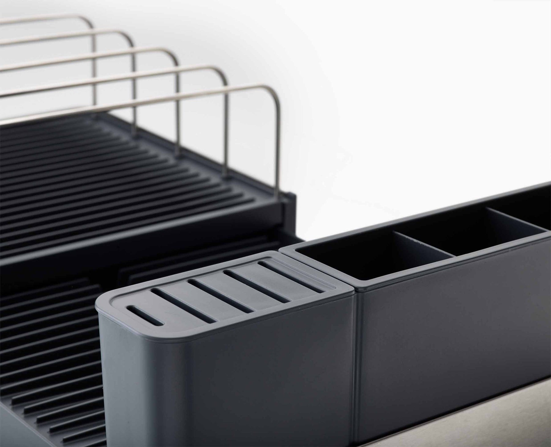 This high-capacity dish rack extends to twice its size to hold larger cookware items and prevent dish rack pile-ups. Featuring a movable spout to drain water, a dedicated draining space for cutlery and raised ribs designed to prevent water from becoming trapped under glasses and bowls. Its fingerprint-proof, stainless-steel makes it easy to maintain, and simply slide the expandable sections back after use to be more compact.