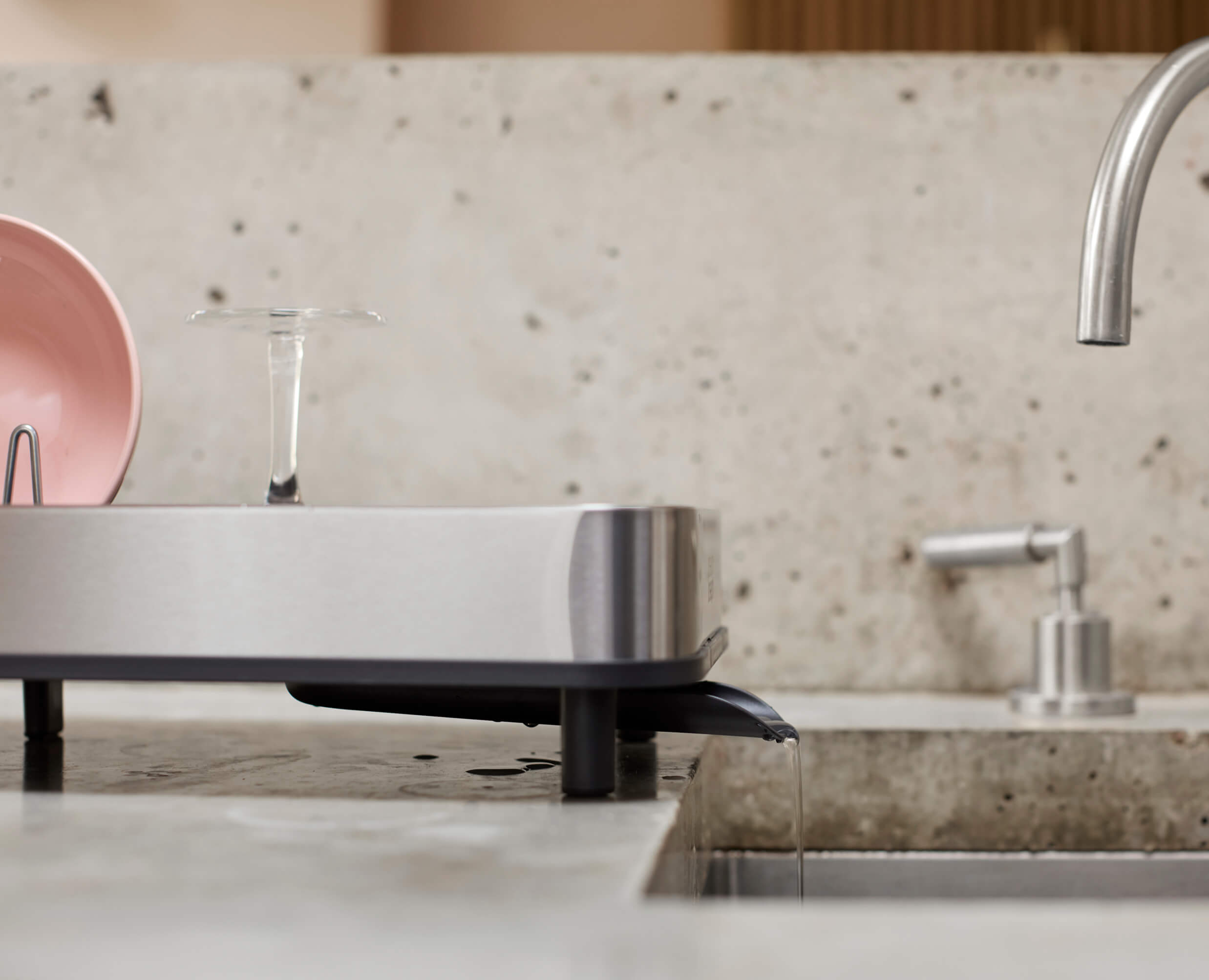 This compact dish drainer expands when you need extra drying space. Adjustable steel prongs secure dishes, while a three-position draining spout prevents water build-up.