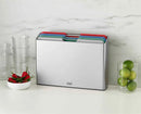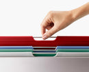 Every great meal starts with a chopping board, so we designed Folio™ to make the food-prep process more efficient and enjoyable. Our chopping board set includes four colour-coded boards with knife-friendly, textured surfaces and non-slip grip feet for safer slicing, chopping and dicing. Stainless-steel bars make it easy to select the board you need from the slim storage case.