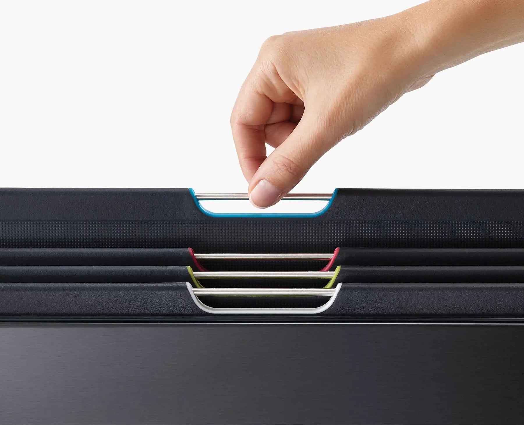 Our 4-piece black chopping board set, Folio™ Steel, is perfect for keeping all your boards organised and easy to access. Each chopping board features knife-friendly textured surfaces and colour-coded details to help make food prep more hygienic and efficient. The finishing touch? A stainless-steel case that keeps the boards neat and tidy on the worktop.