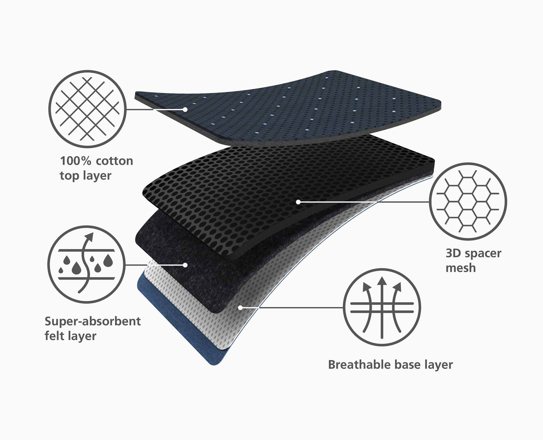 DripShield™ layers: 3D Spacer mesh - 100% Polyester / Felt layer - 100% Polyester / Base layer - 100 Polyester