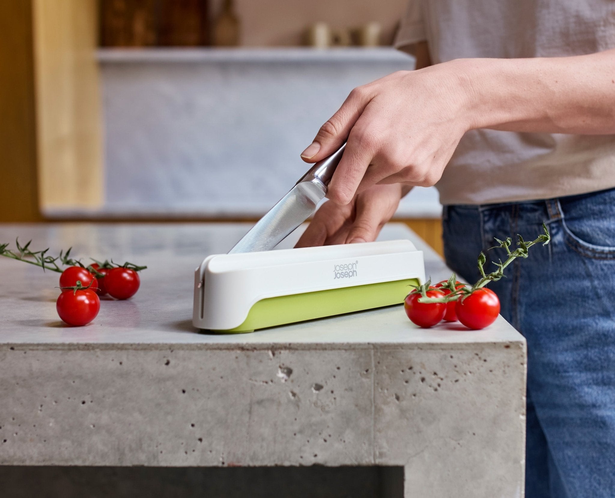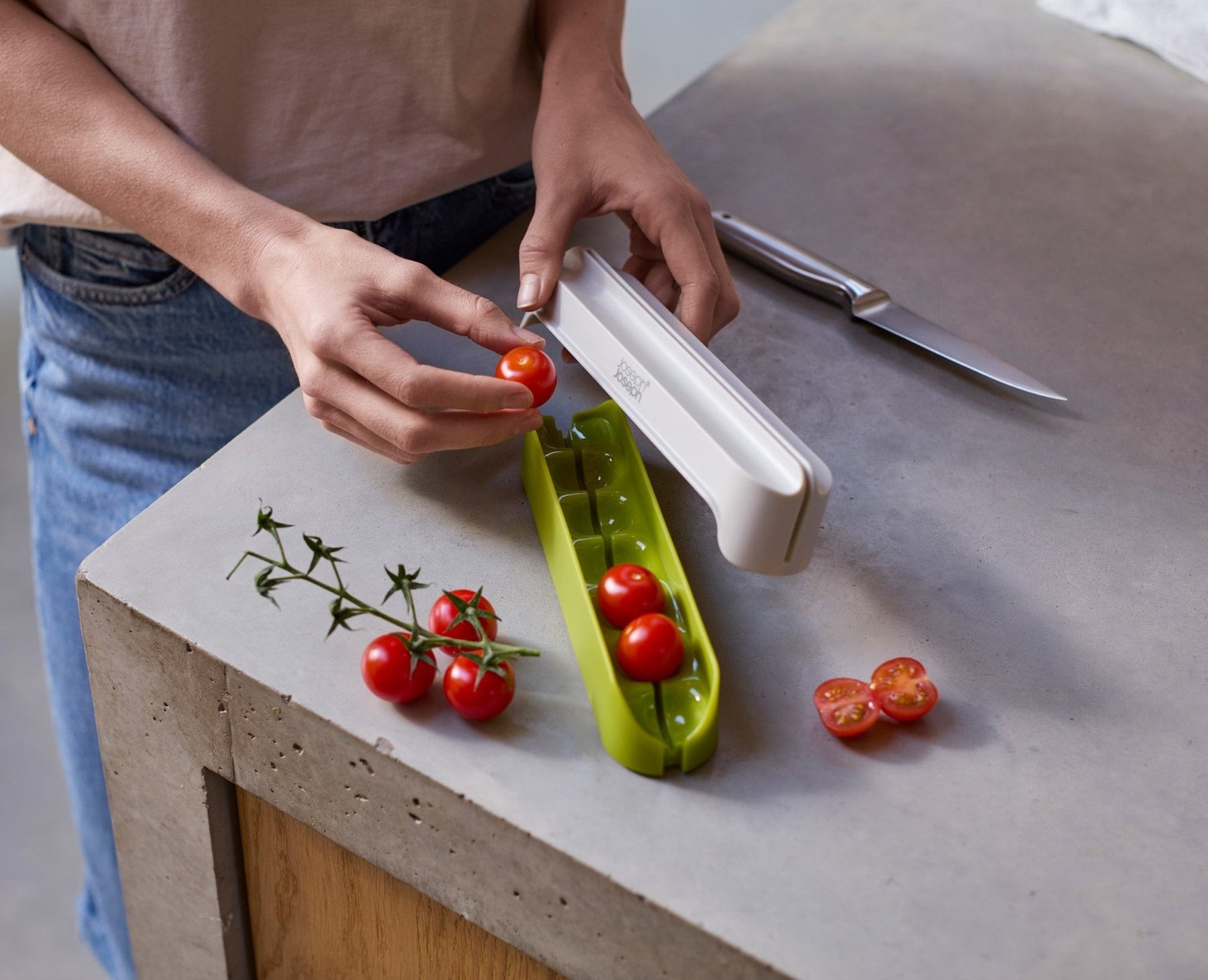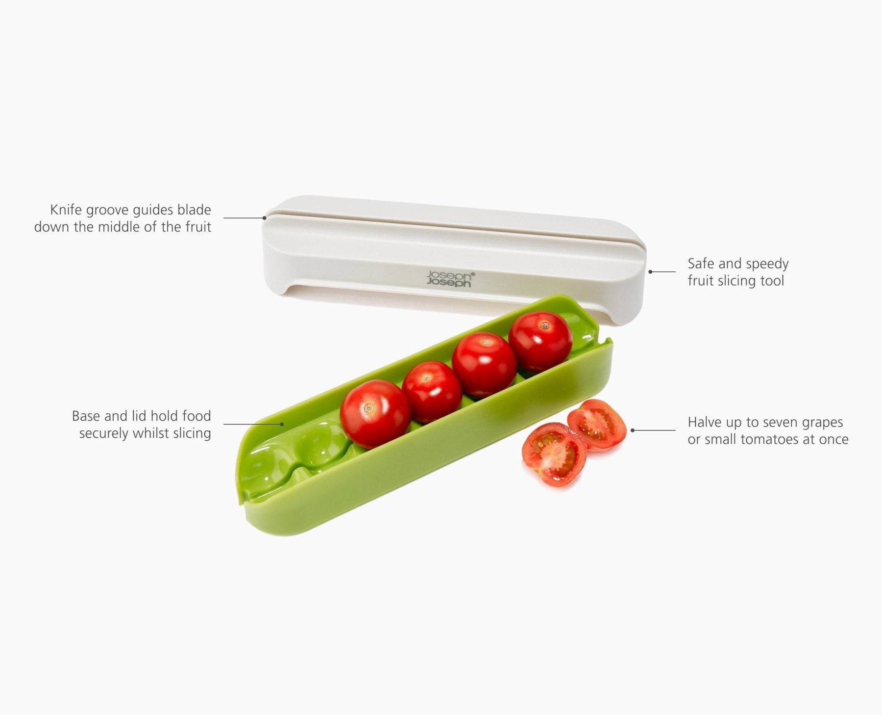 Slice small foods safely and quickly with this handy tool. Load up to seven grapes or cherry tomatoes, place the lid on top, and run a knife through the groove of the grape cutter for even halves.