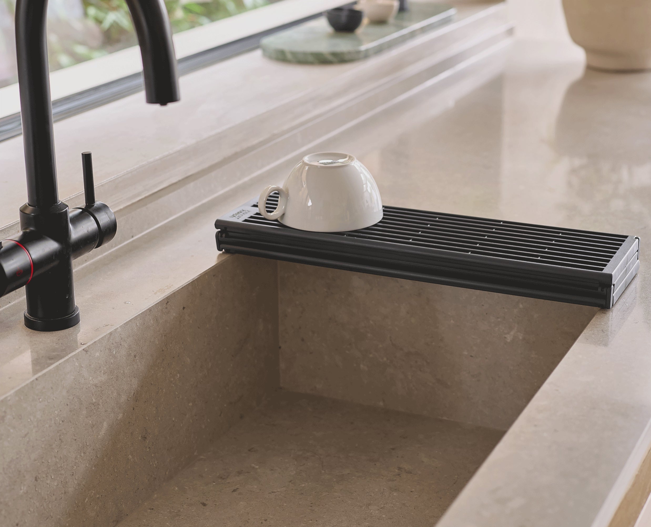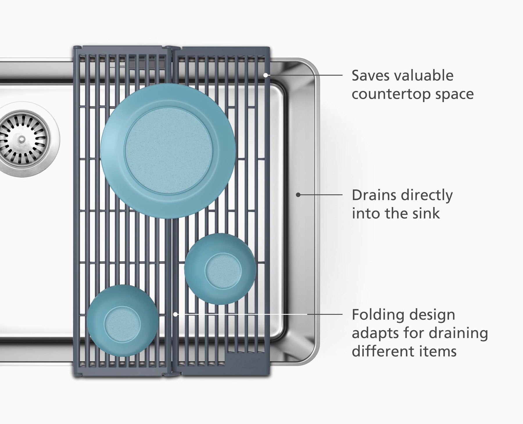 This adjustable over-sink drainer provides additional drying space and can be folded to create more or less room.