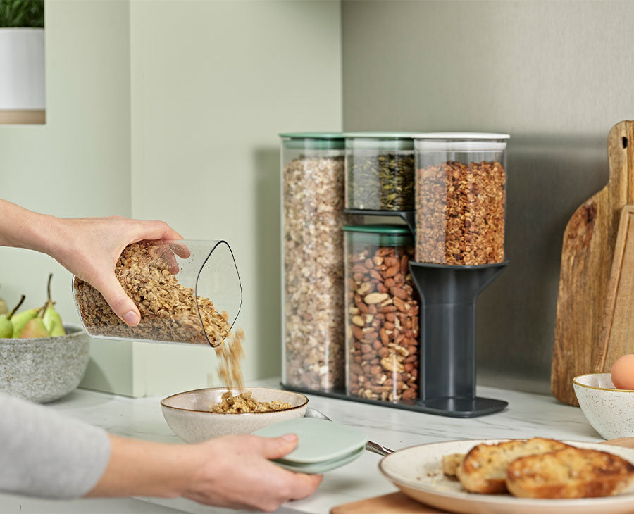 - Containers feature airtight silicone seals and easy-pour corners