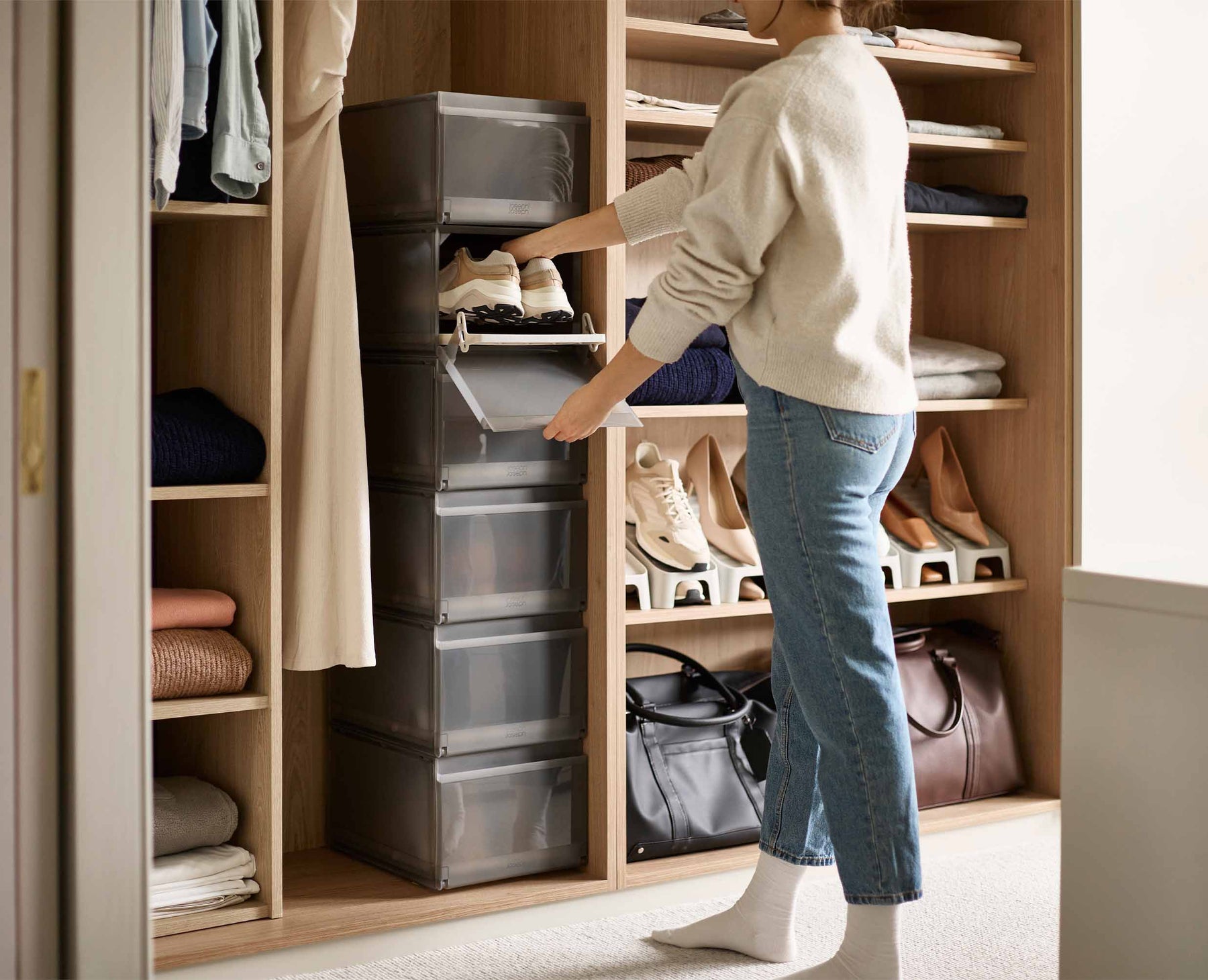 This premium shoe storage box comes fitted with an easy-access tray that slides out when the front is opened. The stackable design is perfect for organised and customisable storage.