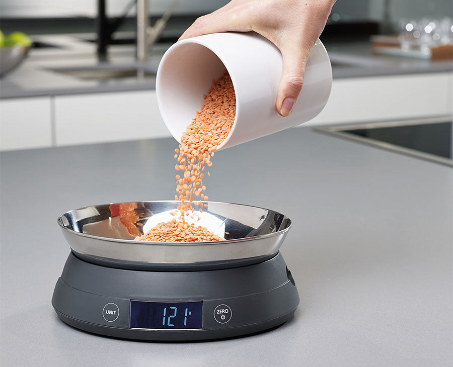 - Easily switch from a bowl scale for weighing loose ingredients to a platform scale for fast weighing of whole items