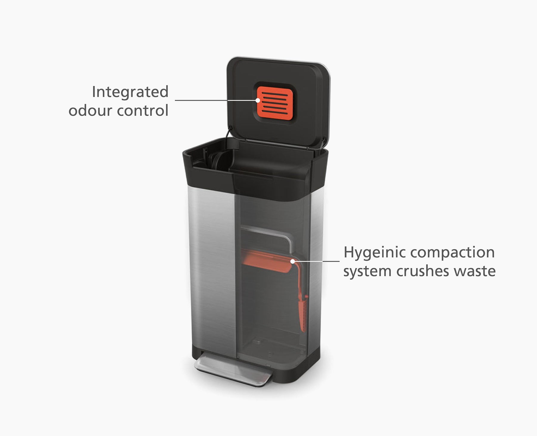 - Easy to use compactor allows you to hold up to 90-litres of waste in the space of a 30-litre bin.