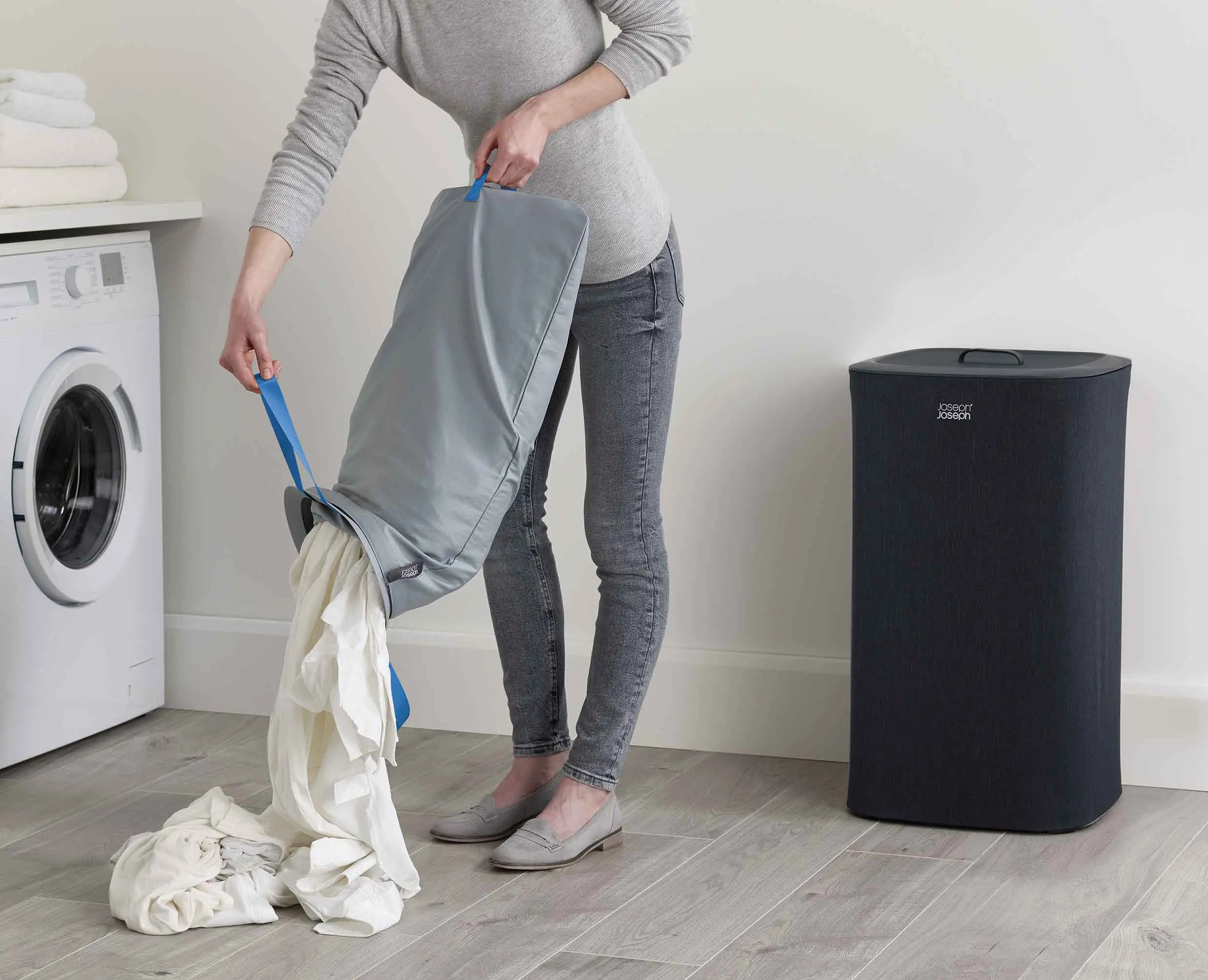 - Removable tote bags with handles makes carrying washing to the machine easy
