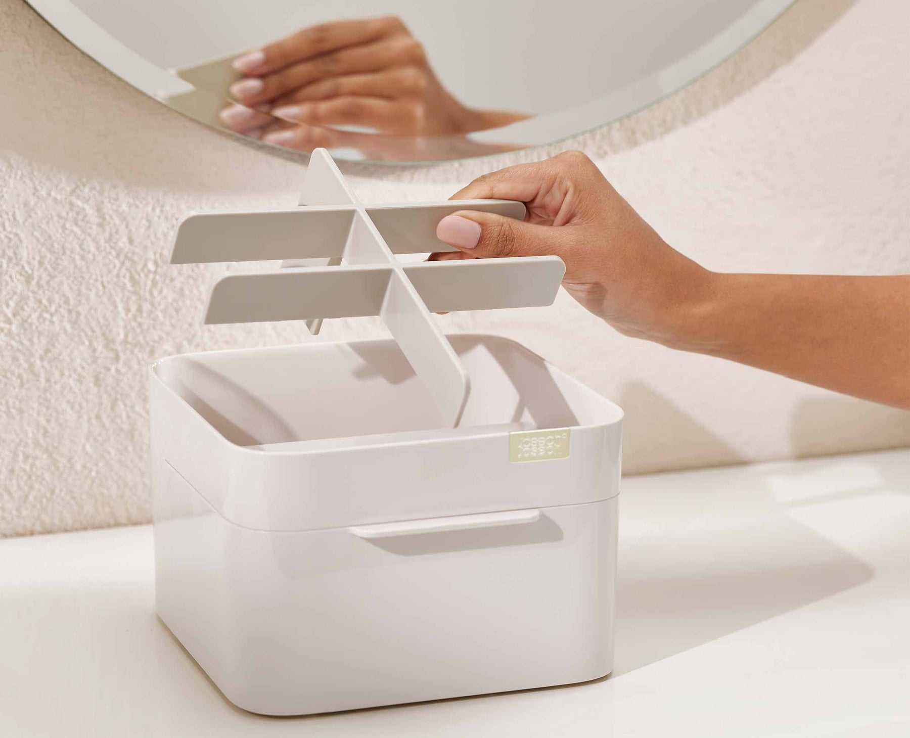 - Drawer with magnetic closure for cotton wool pads, cotton buds and make-up sponges