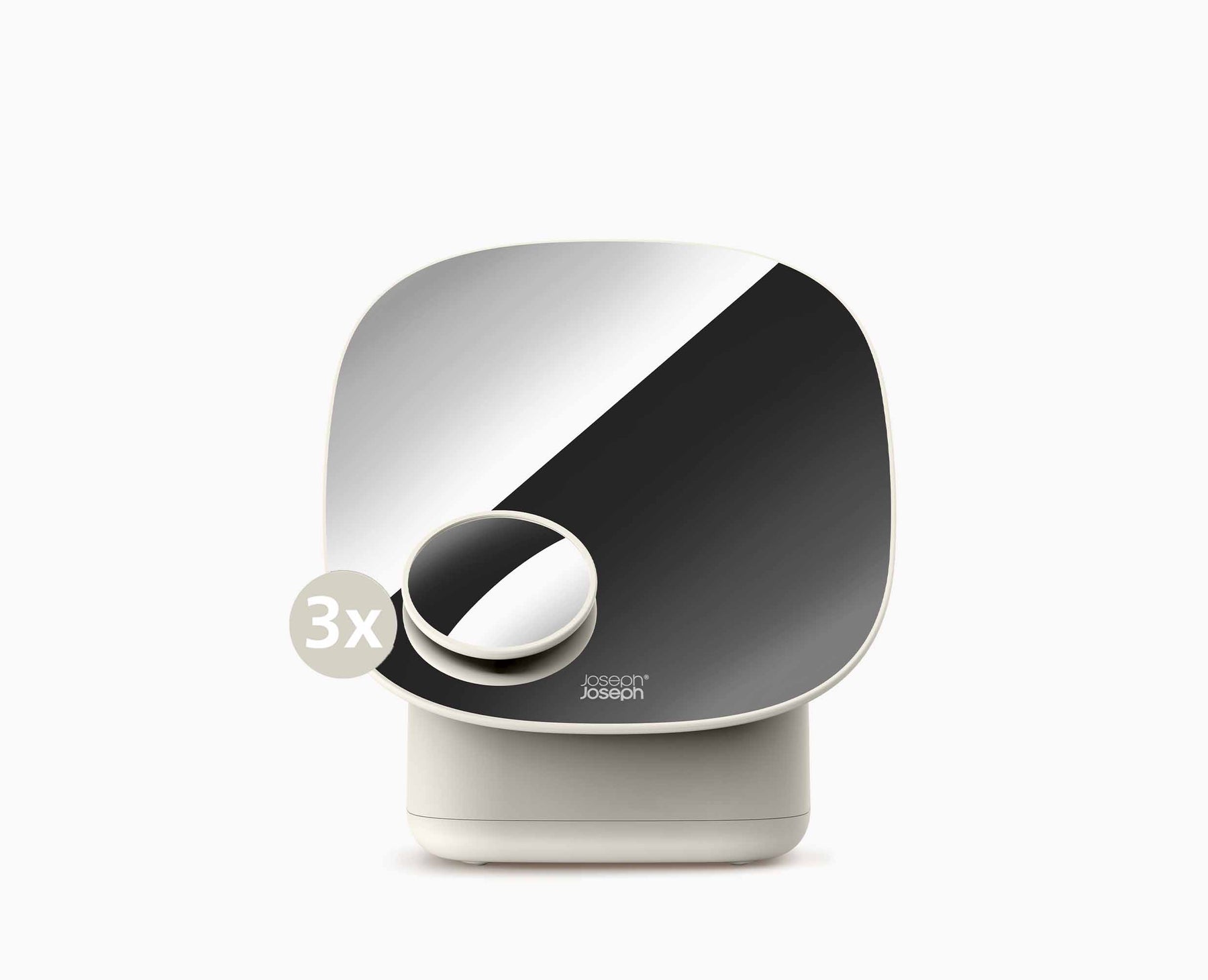 This stylish design combines many of your make-up needs in one compact unit. It features a large, racetrack-shaped mirror giving you a wide view of your face and neck, plus a smaller, 3x magnifying mirror for finer, detailed work.
